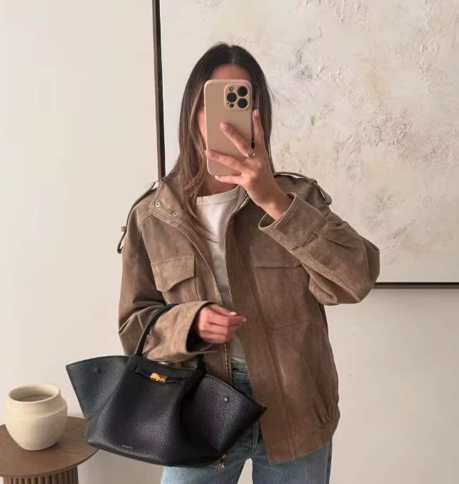 The Novesca Suede Jacket is crafted from 100% premium suede leather, combining effortless chic with cozy comfort. Designed with a high collar, long cuffed sleeves, and shoulder tabs, it offers a refined yet relaxed silhouette. Functional details include chest flap pockets, front pockets, and a zip-up front with a snap-button placket. A timeless fall-winter essential that elevates any wardrobe.